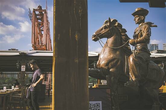 在这里,城市是配菜,琶醍才是主角。这里用木板搭出观景台,城市与江水的延长线,让琶醍的丰腴比穿城的江水高出一层楼,可堪“握住”一曲柔肠。西餐厅为了带动生意,戏弄眼球地将铜像置于门口。酒水服务员与本应在博物馆出现的雕塑同框出现,穿越感极强的“二维马”也不失时机地无意间出现。