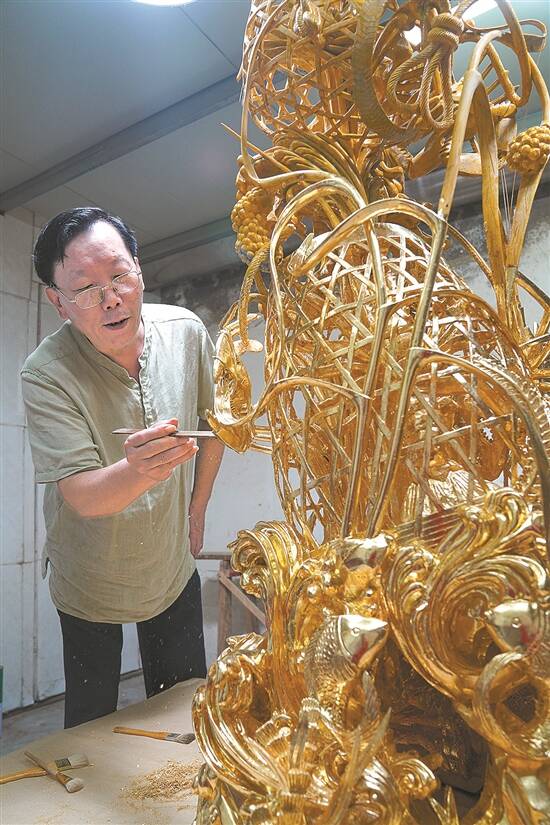 在潮州牌坊街的金子松传统木雕工作室中,几位年轻人以刀为笔、心神专注,正为一米高的蟹篓木雕打磨、贴金。