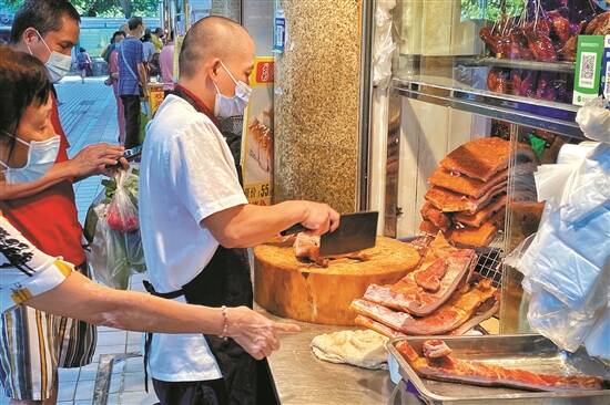 据悉,以前生活条件不好的时候,普通家庭只能在逢年过节,或者家中有喜才能买上一份烧腊回家。尤其是重阳节、农历新年之时,街上的烧腊档口都排着队,大家都喜滋滋地等着“斩料”回家吃团圆饭。如果碰上大场合,乳猪必定会登场。如今,生活条件虽大大改善,但这项往日生活中的传统仍然得到了保留。