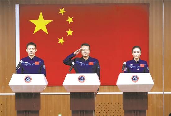 14日,3名乘组航天员翟志刚(中)、王亚平(右)、叶光富在酒泉卫星发射中心问天阁与中外媒体记者集体见面 新华社发