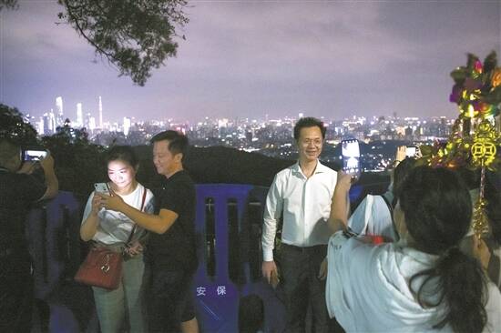 在白云山观景平台,不少市民前来登高远望,与美丽的城市夜景合影 羊城晚报记者 梁喻 摄