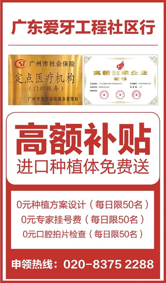为了让市民解决好缺牙问题,“2021广东爱牙工程社区行”正式发放高额看牙补贴,1000颗进口种植体免费送,上门即可获得口腔体检福包(共10000份)一份。凡是有单颗牙缺失、多颗牙缺失、半口/全口牙缺失等缺牙市民,致电020-8375 2288即可申请,名额有限,先到先得!