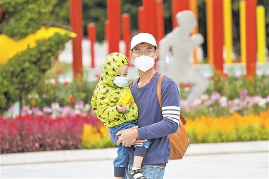 昨日,广州花城广场,大人怀抱裹厚衣的小朋友出门