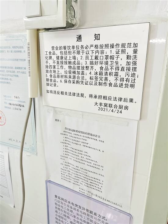 往里面走,每个入驻商家的门口都安装了透明隔板,用于展示该商家的营业执照和食品经营许可证缩印件,有几户商家还将员工的健康证一并展示。在公共通道的显眼处,记者还看到大丰窝挂出的通知,要求营业的餐饮单位,务必严格按照操作规范加工食品,通知要求细化到证照上墙、戴口罩帽子、垃圾桶加盖、冰箱清积霜、保存采购凭证等方面,落款时间正是本报曝光外卖厨房卫生问题的后几日。