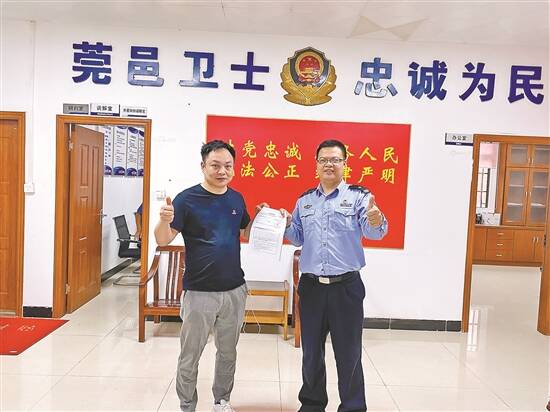“标sir真是个热心人,是个好警长!”今年4月1日,辖区群众梁先生到石碣派出所为女儿办理中考报名所需的居住证明,但因他未进行莞E登记,无法办理居住证明。获悉情况后,黎伟标第一时间联系上梁先生的房东,让房东及时登记梁先生居住信息,随后出具居住证明,并亲自送到梁先生手中。
