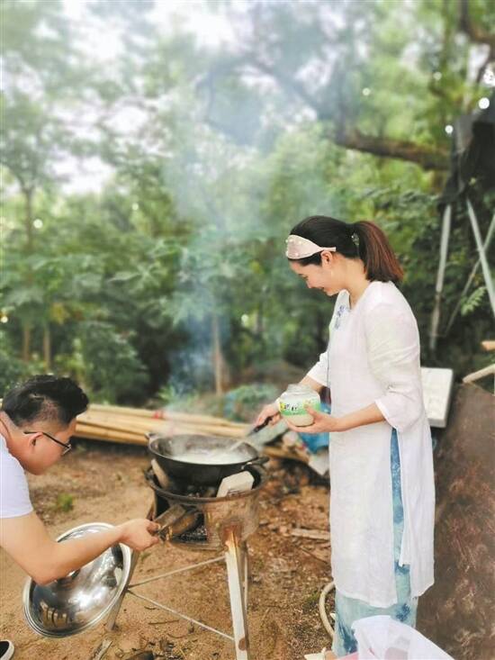 游客在山朵晓苑民宿体验野炊