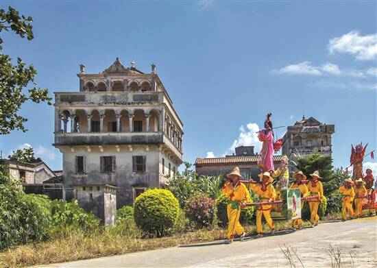 进入第二批国家级非物质文化遗产名录的浮石飘色,300多年前诞生于江门台山浮石村。当地是著名的赵宋“皇族村”,赵姓村民的先祖来自中国北方。而飘色这项源于中国北方“高抬”表演技艺的民俗文化表演,通过数代村民借鉴、传承、复兴方成大器,可谓是历史的奇妙结合。