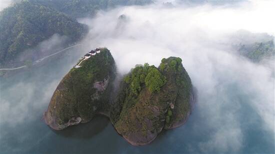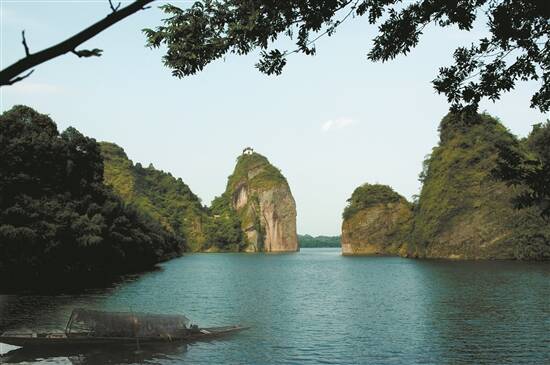 一路向前,船头的两座山峰似一只巨大的“钟”和一面浑圆的“鼓”倒扣在夷望溪东岸,孤高悬绝,怒态凌天。峰间流泉飞泻,水石摩擦之声俨然千鼓齐鸣。泉流绕峰而去,又似笙箫共奏,闻者似可羽化成仙……真羡慕古人,竟能驾一叶扁舟,将他们的诗句镌刻在奇峰峻岭之上。