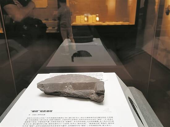 本次展览展出的岭南文房珍品特别值得一看。广州地区考古出土有多个历史时期的文房珍品,其中就有南越文王墓出土的墨丸、石砚,南越国宫署遗址出土的西汉南越国时期的木简和研石及研板、东晋青瓷砚、唐代端砚和宋代“端砚”铭款端砚等。其中,宋代“端砚”铭款端砚为首次与观众见面。