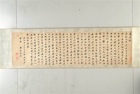 茧纸,古代书画用纸之一。起源于魏晋年间,是继承和发展了东汉蔡伦所用的“树肤”造纸法制成。纸质白细且有光泽,其上纤维交织如蚕茧丝,故美其名曰茧纸。此手卷是用整幅白薄茧纸书就,属于最上乘的一种御贡茧纸标本。