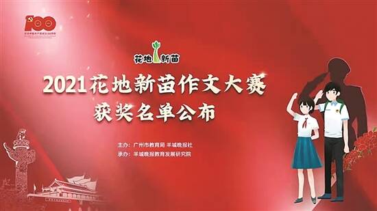 由广州市教育局与羊城晚报社联合主办、羊城晚报教育发展研究院承办的 2021“花地新苗”作文大赛决赛已完成最终评审。本次比赛参加初赛2万余人,入围参加决赛264人,最终现场参加决赛236人。目前共评选出一等奖11名、二等奖43名、三等奖68名,优秀奖114名。并评选出优秀指导老师27名,优秀组织单位19名。优秀奖名单可关注羊城晚报校园达人微信公众号进入【作文大赛】栏目查看。