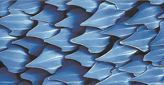 鲨鱼身体呈纺锤形,皮肤表面有一层特殊的鱼鳞——盾鳞。这些盾鳞的长度约为100-200微米,每一片盾鳞上有三个脊状的突起,突起之间又具有圆弧底的沟槽,形成一种“V”形凹槽结构。这些凹槽可阻止旋涡或者是湍流旋涡的形成,于是铺着盾鳞的这种看似粗糙的皮肤,可以让水流掠过皮肤时减小阻力,鲨鱼也就游得更快。科学家正是发现了这种特性,设计出了鲨鱼皮泳衣。