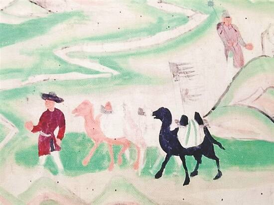 丝路上最常见的另一个交通工具是马。在莫高窟321窟中,有一幅著名的绘制于初唐时期的张骞出使西域图。不同于历史记载中博望侯张骞出于军事目的的“凿空”之旅,在这铺壁画中,张骞出使西域是为了给汉武帝答疑解惑,前往西域大夏国求问两尊祭天金人像的名号。无独有偶,唐时也有这样的一位家喻户晓的人物,骑着马远赴西域求问生命的真谛。在榆林3窟的文殊变中的角落里,就留下了玄奘与弟子的求取真经归来的图像,一位行脚僧双手合十躬身行礼,他身后有一猴子模样的圣众,其后跟着负载着莲座包裹的白马,正是耳熟能详的《西游记》中的桥段。