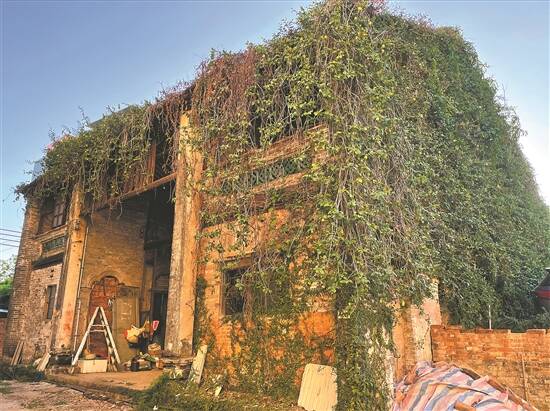 如今,观海楼的屋顶和外墙绿藤盘绕,墙体老化,有部分坍塌,角落结着蛛网,大厅置放着一些杂物,地上铺着历经年月的枯枝败叶。同行的村干部解释,观海楼为黄氏族人三家所分,因产权模糊荒置至今,尚未修缮。