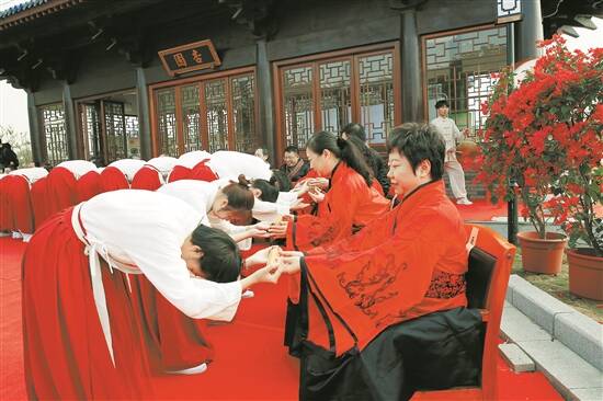 仪式现场,在铿锵锣鼓声中,传承班全体弟子面朝东方行三拜之礼。一拜:华夏文明,得蒙先庇;二拜:先圣之道,功过古今;三拜:格物致知,修身治齐。礼毕,弟子们齐声诵读《大医精诚》节选。随后,弟子上台呈拜师帖,并向老师献上六礼。六礼包括:芹菜,寓意业精于勤;肉干,孔子规定的拜师礼;桂圆,寓意功德圆满;红枣,寓意早早高中;红豆,寓意红运高照;莲子,寓意苦心教育。