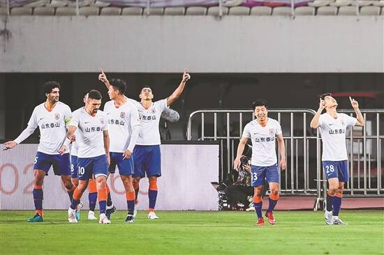 山东泰山球员孙准浩(右一)在进球后庆祝 新华社发