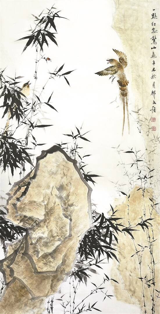 一点红瓢惊山鸟(国画)