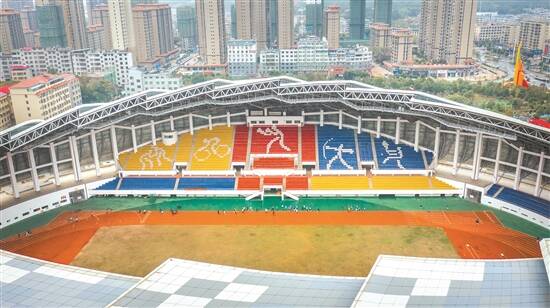 江西瑞金是共和国体育的故乡,图为瑞金市体育中心体育场,场内市民们正在跑步健身