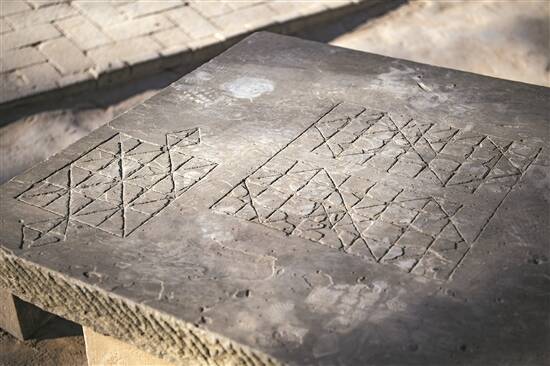 延安枣园朱德旧居石桌上的图案,右边大棋盘是传统的象棋,左边的小棋盘是地方棋,当地称之为“憋死牛”“老虎吃绵羊”或“狼吃娃”
