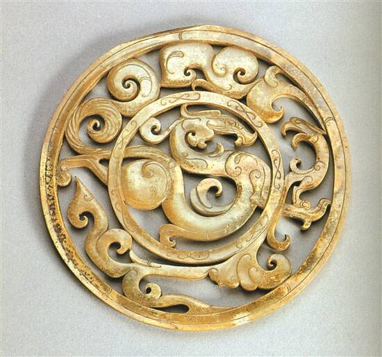 在古代中国文化中,龙和凤常作为阴阳和谐的标志出现在许多器物上。在楚文化玉器中,龙凤纹饰是常见的装饰,凡是龙凤配合出现的纹饰,龙必居中,凤则处于附属的位置,这一特点在透雕龙凤纹重环玉佩上体现得淋漓尽致。龙飞凤舞、龙凤呈祥、游龙戏凤,诸多吉祥寓意通过这块玉佩得到了充分的体现,代表着尊贵和祥瑞的龙凤组合寄托了世人对于最美好事物的极致追求。