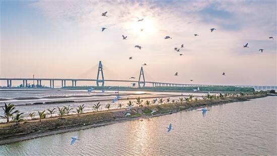 通明海特大桥以“S”形连接西岸,形成一条曲线,守护着“候鸟天堂”