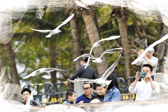 游客在深圳湾公园与海鸥互动