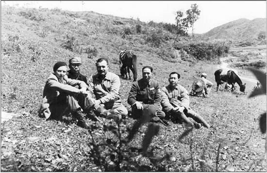 海明威(左3)和玛莎(左1)在粤北前线部队采访时留影(资料图片)