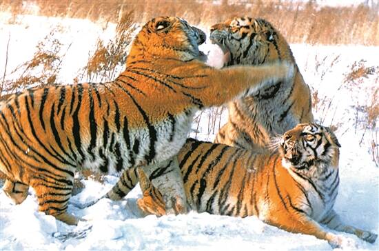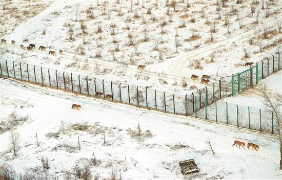 “中心”过去饲养繁育东北虎单体笼养,转移至野化基地变为野外驯养,四季融入大自然之中。冬季白雪飘飘,银装素裹;夏季草木葱茏,生机盎然。色彩斑斓的东北虎在白雪的映衬下,显得强悍无双。害怕虎虎相斗两败俱伤,养虎人要昼夜为陆续进入野化区的东北虎划定“山头”,现在野化区域内的成虎都有了各自的“领地”,占山为王。其中有独来独往的,有兄弟姐妹三五成群的,有相互缠绵的情侣,各霸一方。生存能力、奔跑速度、捕食技能和耐寒强度都适应了野外生活。