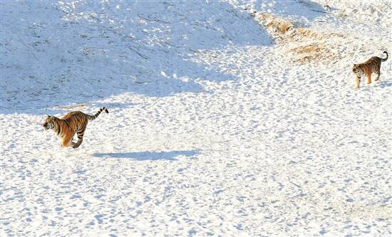 2021年入冬后降雪密集且雪量较大,天寒虎欢,“虎情侣”们在茫茫雪野里亲密缠绵。在野化区里看到雄虎向身下的雌虎发起“攻势”,雌虎回头用前爪搂抱雄虎的脖子以示回应,两虎你来我往,渐入佳境;也有一只雄虎看到同伴将成好事,心生不平,趁两虎忘我之际,上去就是几掌把骑在雌虎身上的雄虎打下,阻止交配。
