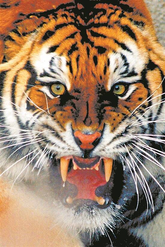 东北虎的嘴上下各长两只犬齿,长约6厘米,捕咬猎物时,咬合力达500公斤