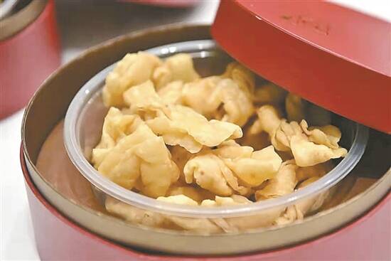 白云宾馆出品的纯手工酥角特别受“唯美族”的喜爱。这种酥角由餐厅点心师傅纯手工制作,做工考究,锁边漂亮,且每天仅有100份售卖。熟门熟路的街坊们都会提前预订这个星级老字号的传统春节油器。