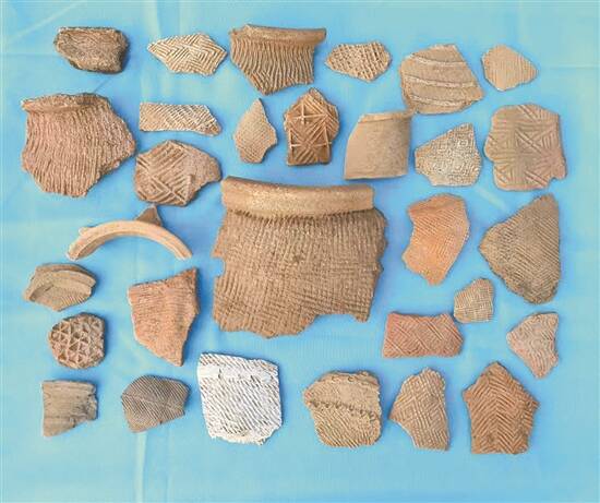 出土遗物中,有玉质精美的玉环、纹饰繁多的陶片,以及锛、镞、砺石等石器。陶片以夹砂陶为主,夹杂少量泥质陶,纹饰种类繁多,有绳纹、曲折纹、菱格纹、方格纹等十多种纹饰,可辨识器形有罐、釜、豆等,推测当时的人们已经具有一定的审美水平,且当地的制陶工艺较为成熟。
