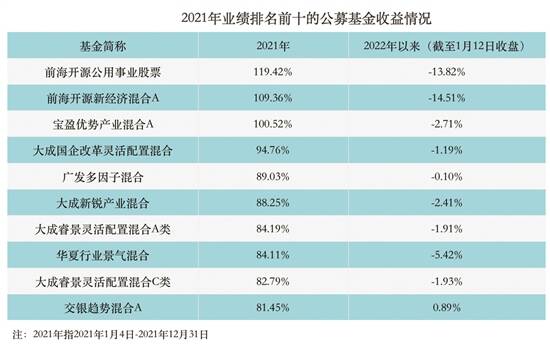 基金普跌之下,“冠军魔咒”尤为引人关注。同花顺ifind数据显示,前海开源公用事业股票、前海开源新经济混合A、宝盈优势产业混合A、大成国企改革灵活配置混合以及广发多因子混合位列2021年公募基金业绩争霸榜单前五位,分别为持有人带来119.42%、109.36%、100.52%、94.76%以及89.03%的丰厚回报。