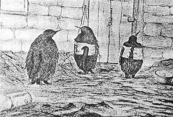 国际极地年德国探险队的三只宠物小王企鹅,它们身着皮质紧身衣(最初发表于1890年)