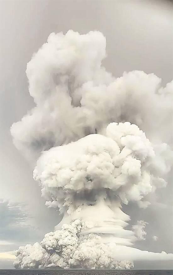 火山灰云突破对流层顶,形成了直径近500公里的伞形云团,伞形云团周边的巨大冲击波清晰可见 新华社发