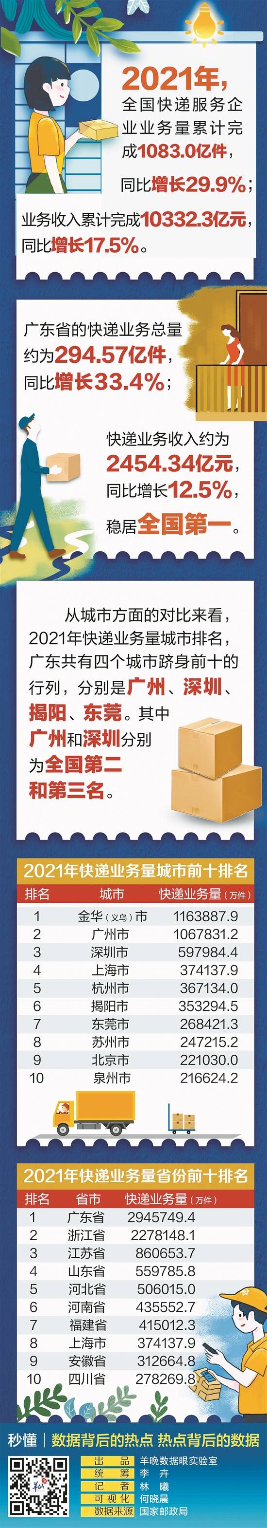 近年来,电商行业发展飞速,网购成为许多人不可或缺的日常,而快递成为电商行业运输的必备一环。国家邮政局近日公布了2021年邮政行业运行情况的数据显示,我国邮政行业业务收入累计完成了12642.3亿元,同比增长了14.5%;业务总量累计完成13698.3亿元,同比增长25.1%。其中,广东省的快递业务总量约为294.57亿件,同比增长33.4%;快递业务收入约为2454.34亿元,同比增长12.5%,量价双双稳居全国第一。羊城晚报记者注意到,在2021年快递业务量排名中,广东共有四个城市跻身前十,分别为广州、深圳、揭阳、东莞,其中广州更成为全国仅有的两个业务量突破百亿件的城市之一,2021年,广州快递业务量占到全国的10%。