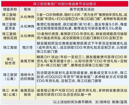 珠江投资集团广州区域的多个楼盘春节期间正常接待,该集团最吸引的活动即与2021英雄联盟世界总决赛冠军战队EDG联手推出的2022年货节,派出包括纪念卫衣、签名队服、主题礼包等年货好礼。羊城晚报记者了解到,大型社区珠江壹城的多个组团分别推出一口价单位、低至9.5折的专属折扣、成交即送珠江红船门票等活动;英式下午茶、糖画DIY等特色活动分别见于珠江海御、珠江铂世湾。(徐炜伦)