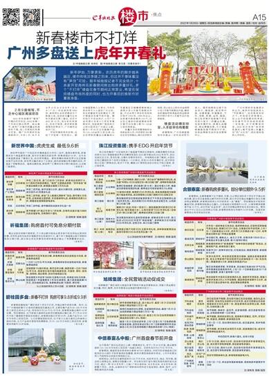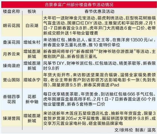 新春期间,合景泰富旗下位于增城、花都、白云等区域的多个项目齐齐推出促销优惠:部分项目直接推出额外的折扣优惠,部分项目则推出限量特价单位及赠送物业管理费,新春期间购房比平时购房多一些“着数”。例如增城朱村板块的叠溪花园,新春期间就推出五重礼,分别是部分房源额外9.5折、10套特惠房源最高节省18万元、成交可抽“足金老虎”、成交可获赠品牌家电及来访抽红包。哪怕是位于中心区白云区的朗云花园,新春期间购房也有额外9.8折优惠。各盘在新春期间也有多样活动迎客。(徐炜伦)