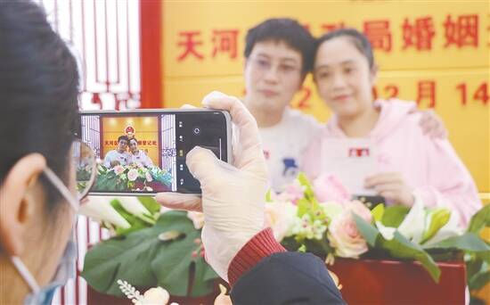 羊城晚报讯 记者符畅、实习生温泽广,通讯员廖培金报道:2月14日是新人扎堆结婚的热门日子。记者此前了解到,今年2月22日从数字上看是“20220222”,是难得一遇的“对称日”,因此不少新人选择在这一天结婚,预计元宵节前后一两天登记结婚热度有所下降。不过今早记者走访了解到,今天广州市仍有不少新人“拉埋天窗”。