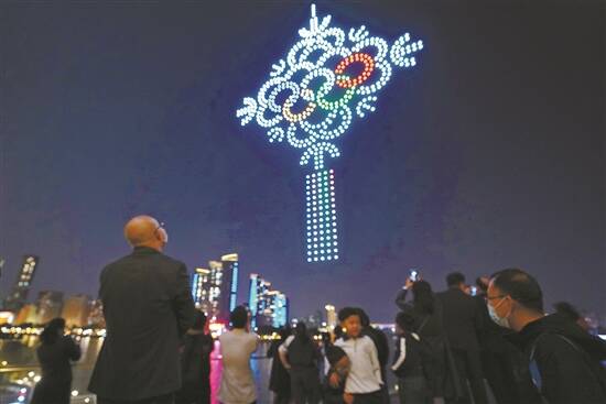 羊城晚报讯 记者罗仕报道:昨晚,广州市政府新闻办在白天鹅宾馆四楼平台举行元宵节主题无人机编队飞行表演。在皎洁的月光下,无人机编队在空中变幻出中国结、花灯、永庆坊牌坊、运动健儿等图案,庆祝元宵佳节。