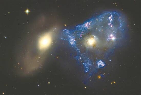 美国国家航空航天局(NASA)最近发布了一张哈勃望远镜拍摄的新图片。画面中,两个星系在正面碰撞,形成一个“三角形”的罕见的恒星诞生区域。