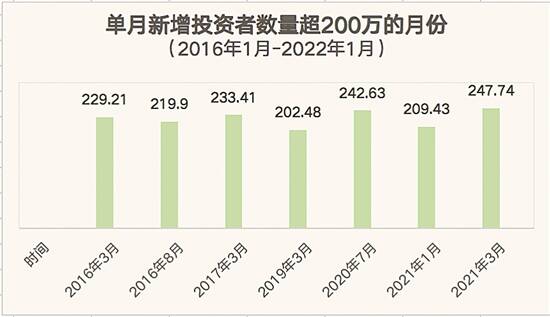2016年1月,投资者数量首次突破1亿,此后投资者数量总体以每月百万以上的数量增加,高峰期每月新增200万以上,2019年3月,投资者数量首次突破1.5亿。一年前的2021年2月,投资者数量首次突破1.8亿,如今正式突破2亿大关。总的来看,投资者数量从1亿到2亿,总共历时6年。