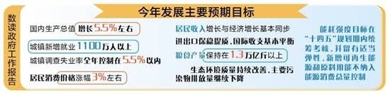 李克强在报告中提出,2022年发展主要预期目标是:国内生产总值增长5.5%左右;城镇新增就业1100万人以上,城镇调查失业率全年控制在5.5%以内;居民消费价格涨幅3%左右;居民收入增长与经济增长基本同步;进出口保稳提质,国际收支基本平衡;粮食产量保持在1.3万亿斤以上;生态环境质量持续改善,主要污染物排放量继续下降;能耗强度目标在“十四五”规划期内统筹考核,并留有适当弹性,新增可再生能源和原料用能不纳入能源消费总量控制。