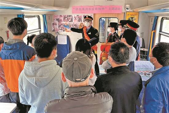 车厢中正在开展“讲故事,传承雷锋精神”主题活动