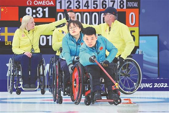 羊城晚报讯 记者詹淑真、实习生梁令菲报道:昨日,北京冬残奥会进行残奥轮椅冰壶循环赛,中国轮椅冰壶队在国家游泳中心迎战瑞典队。前6局,中国队以0比5落后,第7局扳回一分,最终以1比5负于瑞典队。