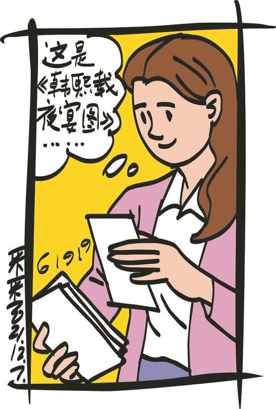 这些年小县城的变化确实很大,街道两边高楼林立,马路上各种小轿车来回穿梭不息,街道两边的商铺里各种商品琳琅满目应有尽有,林女士搀着母亲边看边走,当走到一彩票店门前,林女士被彩票店门前桌上五彩缤纷的刮刮彩吸引住了。于是走过去欣赏起刮刮卡上那些精彩的图案,销售彩票的店主见状说:“买几张试试吧,说不定中大奖呢。”林女士笑着没吭声,突然,其中一款《韩熙载夜宴图》的刮刮卡图案吸引了她。凭职业敏感,林女士认出这款《韩熙载夜宴图》是五代十国时期南唐画家顾闳中的绘画作品,于是她拿起来仔细欣赏起来。