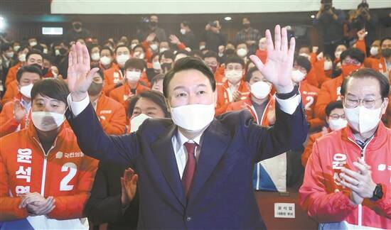 3月10日,韩国国民力量党候选人尹锡悦(前)在总统选举中获胜后挥手致意 新华社发