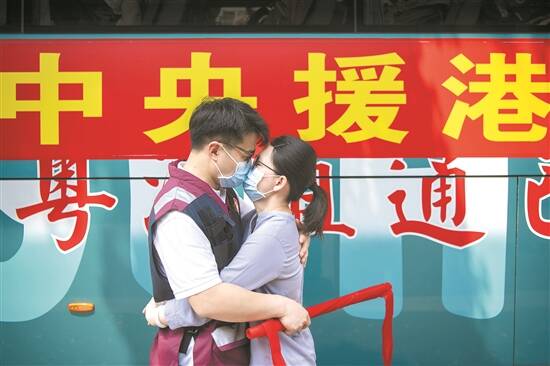 14日中午,内地援港医疗队集结出发现场,一名援港队员与妻子依依惜别 羊城晚报记者 梁喻 摄