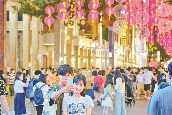 入夜,不少街坊在北京路步行街逛街购物,开心“买买买”