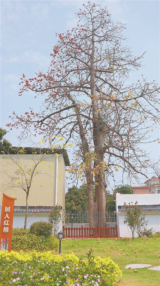 记者15日来到位于明经村的陈树人、陈复故乡园,一棵高大挺拔的木棉树映入眼帘,火红的木棉花缀满枝头。